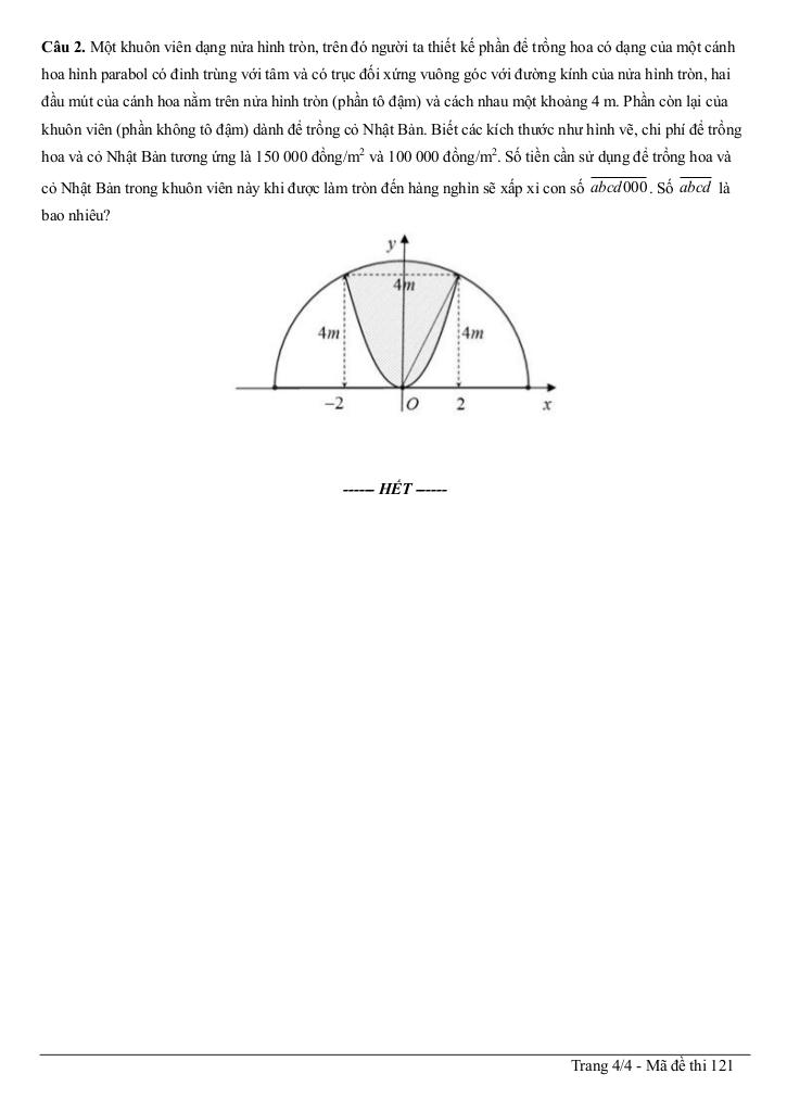 + Một khuôn viên dạng nửa hình tròn, trên đó người ta thiết kế phần để trồng hoa có dạng của một cánh hoa hình parabol có đỉnh trùng với tâm và có trục đối xứng vuông góc với đường kính của nửa hình tròn, hai đầu mút của cánh hoa nằm trên nửa hình tròn (phần tô đậm) và cách nhau một khoảng 4 m. Phần còn lại của khuôn viên (phần không tô đậm) dành để trồng cỏ Nhật Bản. Biết các kích thước như hình vẽ, chi phí để trồng hoa và cỏ Nhật Bản tương ứng là 150 000 đồng/m2 và 100 000 đồng/m2. Số tiền cần sử dụng để trồng hoa và cỏ Nhật Bản trong khuôn viên này khi được làm tròn đến hàng nghìn sẽ xấp xỉ con số abcd000. Số abcd là bao nhiêu?