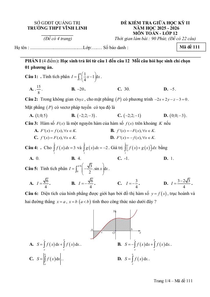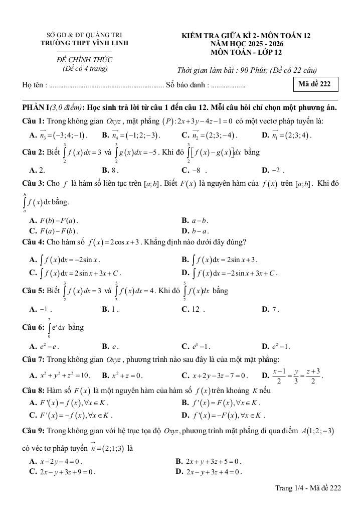 Trích dẫn Đề giữa kỳ 2 Toán 12 năm 2025 – 2026 trường THPT Vĩnh Linh – Quảng Trị: