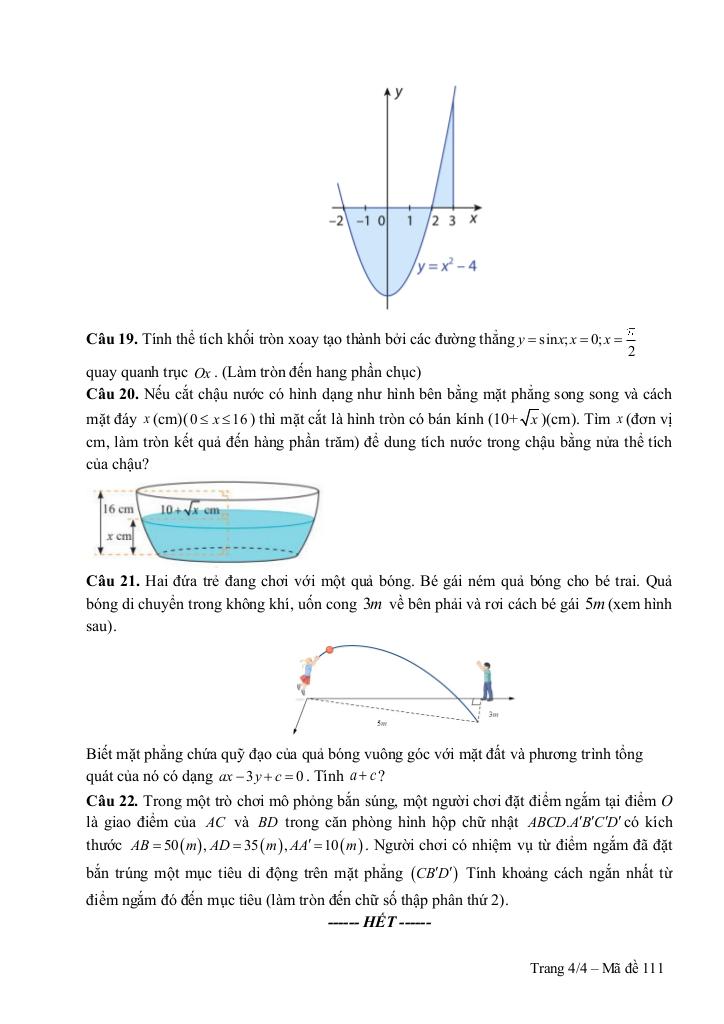 + Nếu cắt chậu nước có hình dạng như hình bên bằng mặt phẳng song song và cách mặt đáy x (cm) (0 ≤ x ≤ 16) thì mặt cắt là hình tròn có bán kính (10 + √x) (cm). Tìm x (đơn vị cm, làm tròn kết quả đến hàng phần trăm) để dung tích nước trong chậu bằng nửa thể tích của chậu?