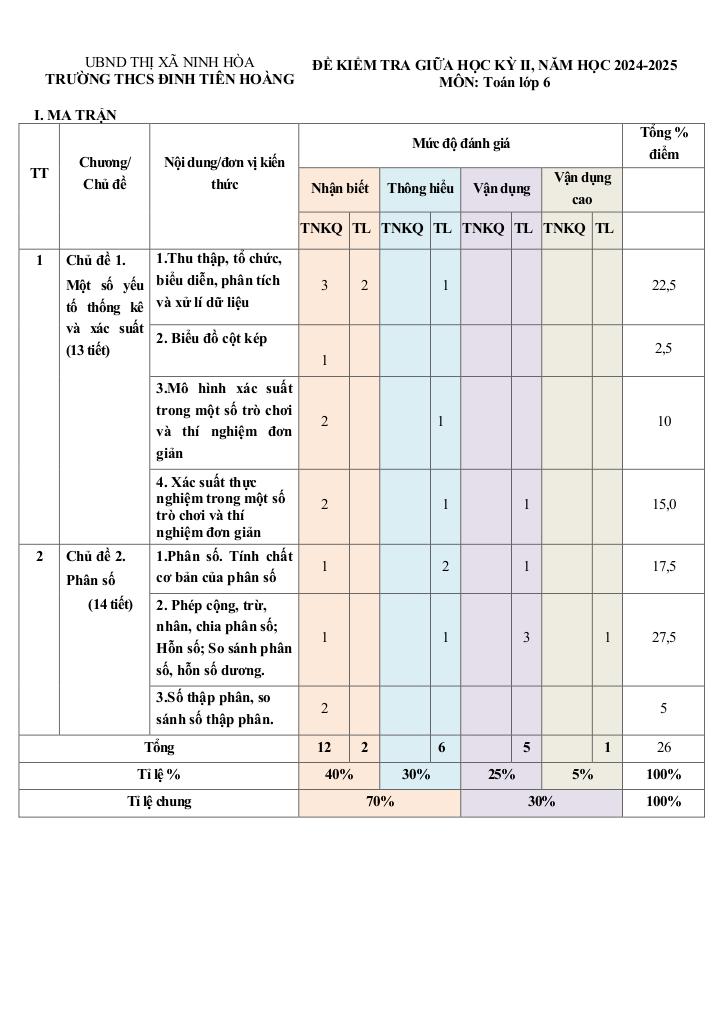 Ma trận Đề giữa kỳ 2 Toán 6 năm 2024 – 2025 trường THCS Đinh Tiên Hoàng – Khánh Hòa: