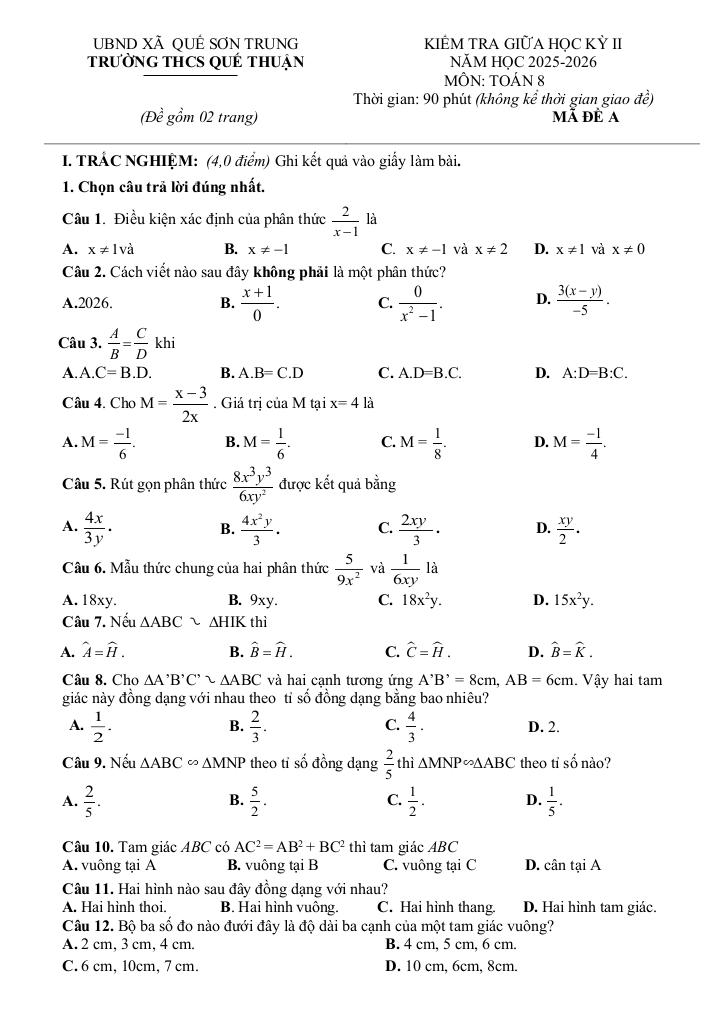 Nội dung Đề giữa kỳ 2 Toán 8 năm 2025 – 2026 trường THCS Quế Thuận – Đà Nẵng: