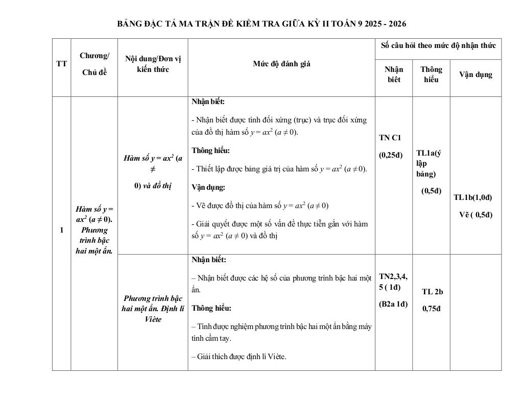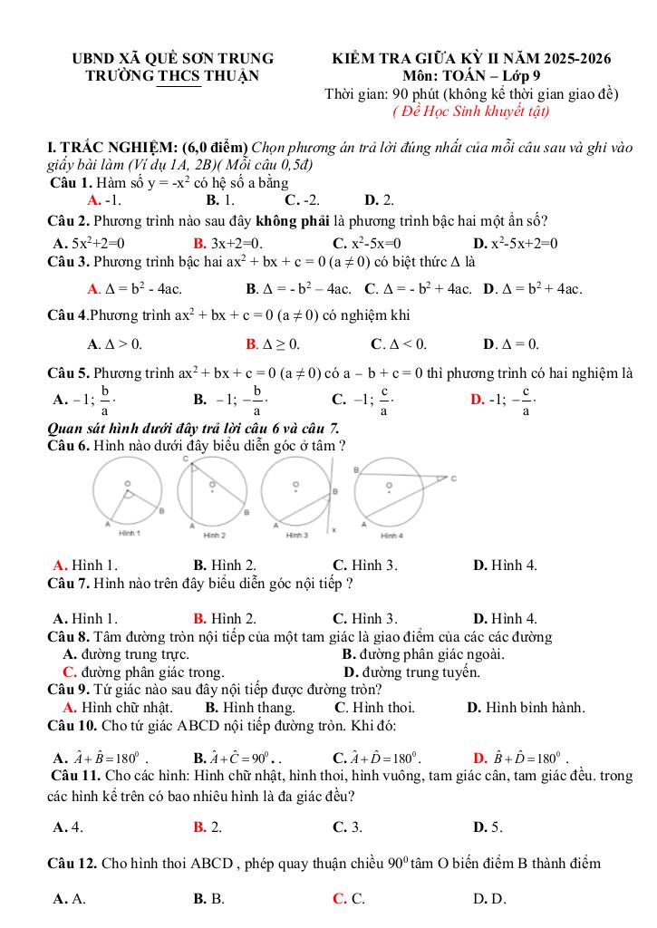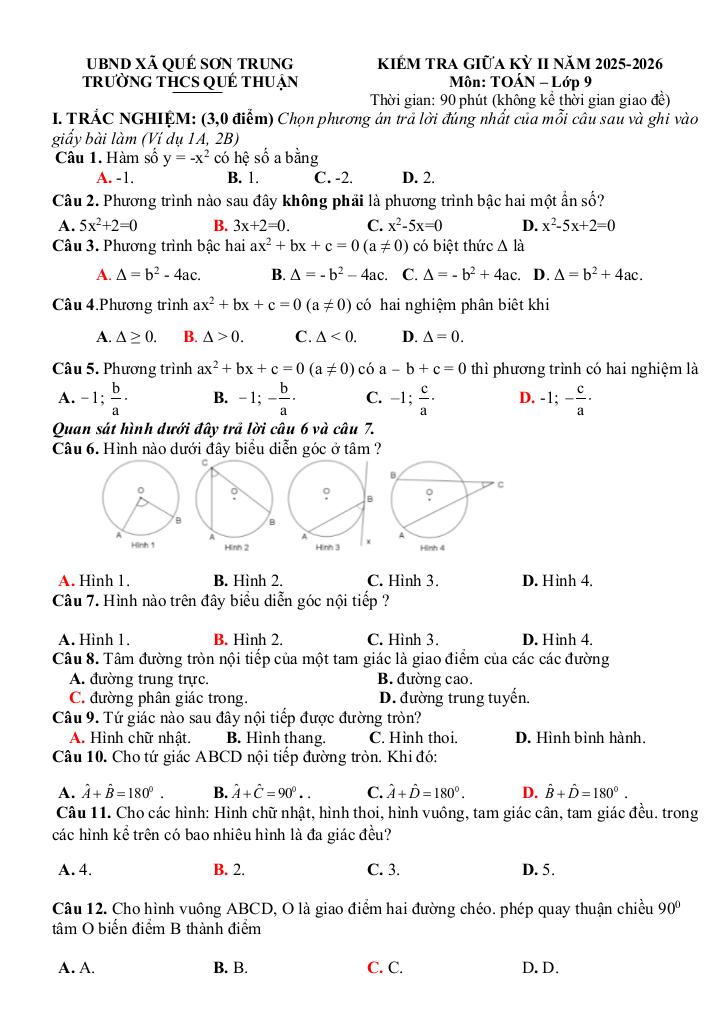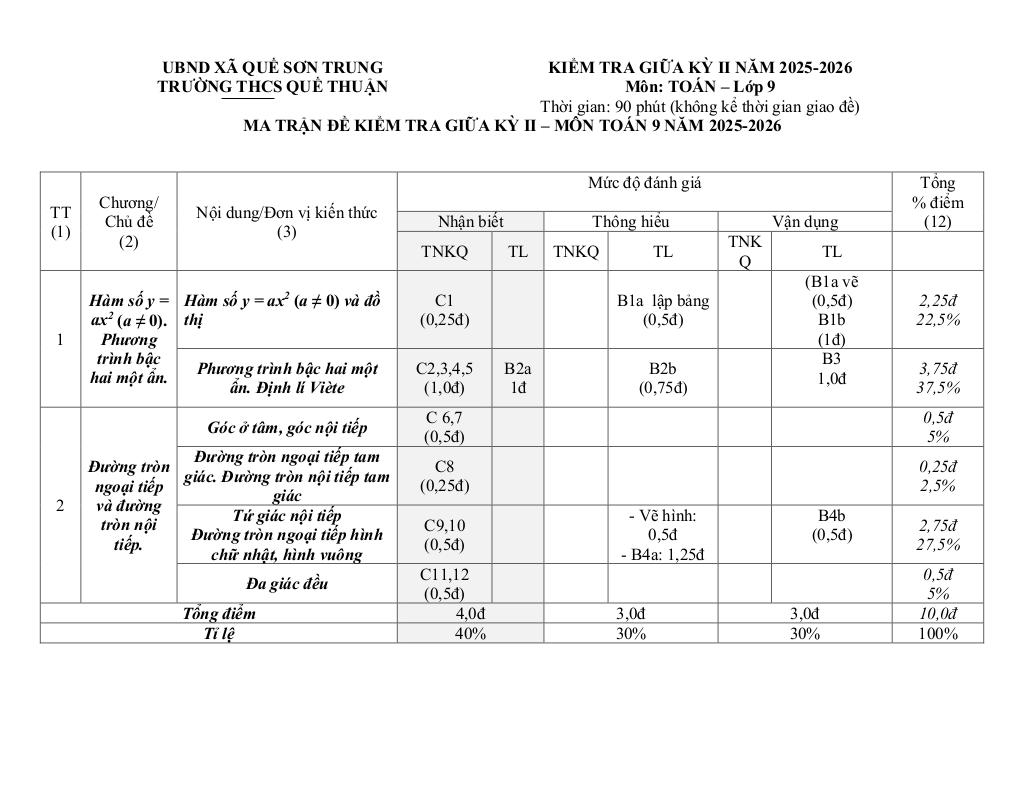 Nội dung Đề giữa kỳ 2 Toán 9 năm 2025 – 2026 trường THCS Quế Thuận – Đà Nẵng: