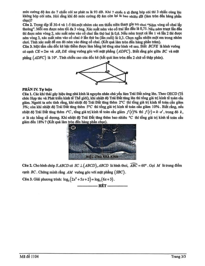 + Các khí thải gây hiệu ứng nhà kính là nguyên nhân chủ yếu làm Trái Đất nóng lên. Theo OECD (Tổ chức Hợp tác và Phát triển kinh tế Thế giới), khi nhiệt độ Trái Đất tăng lên thì tổng giá trị kinh tế toàn cầu giảm. Người ta ước tính rằng, khi nhiệt độ Trái Đất tăng thêm 2°C thì tổng giá trị kinh tế toàn cầu giảm 3%; còn khi nhiệt độ Trái Đất tăng thêm 5°C thì tổng giá trị kinh tế toàn cầu giảm 10%. Biết rằng, nếu nhiệt độ Trái Đất tăng thêm r°C, tổng giá trị kinh tế toàn cầu giảm f(t)% thì f(t) = k.a^t, trong đó k, a là các hằng số dương. Khi nhiệt độ Trái Đất tăng thêm bao nhiêu °C thì tổng giá trị kinh tế toàn cầu giảm đến 18%? (Kết quả làm tròn đến hàng phần chục).