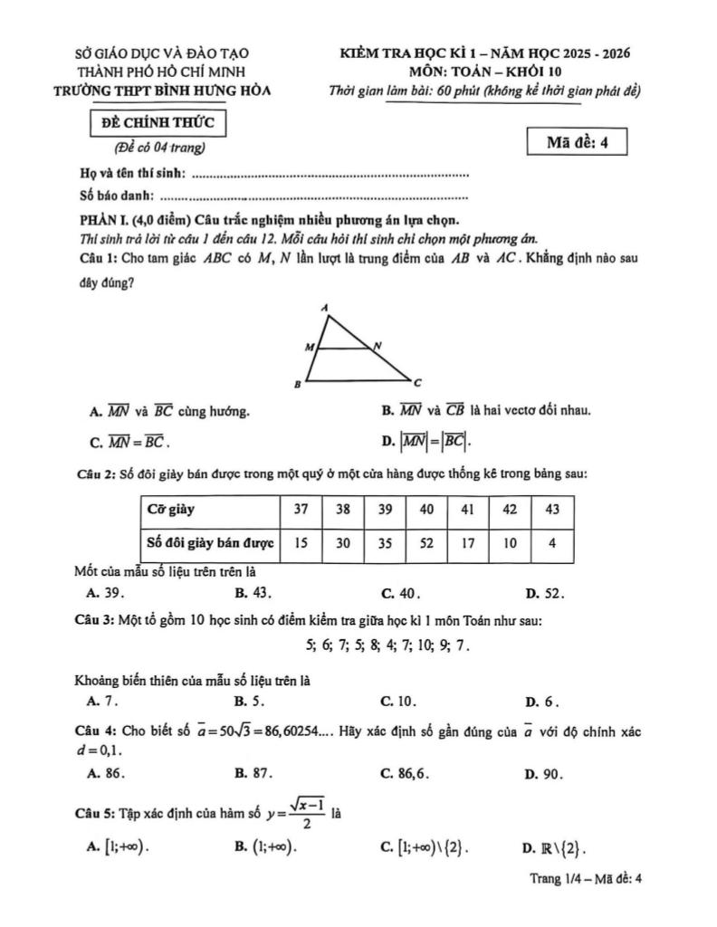 Trích dẫn Đề học kì 1 Toán 10 năm 2025 – 2026 trường THPT Bình Hưng Hòa – TP HCM: