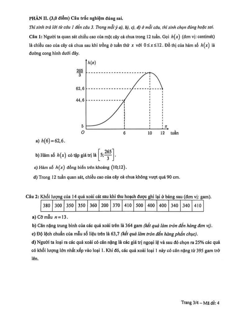 + Khối lượng của 14 quả xoài cát sau khi thu hoạch được ghi lại ở bảng sau (đơn vị: gam). a) Cỡ mẫu n = 13. b) Cân nặng trung bình của các quả xoài trên là 364 gam (kết quả làm tròn đến hàng đơn vị). c) Độ lệch chuẩn của mẫu số liệu trên là 63,7 (kết quả làm tròn đến hàng phần chục). d) Người ta loại ra các quả xoài có cân nặng là các giá trị ngoại lệ và sau đó chọn ra 25% các quả có khối lượng lớn nhất xếp vào loại 1. Khi đó, các quả xoài loại 1 này có cân nặng từ 395 gam trở lên.