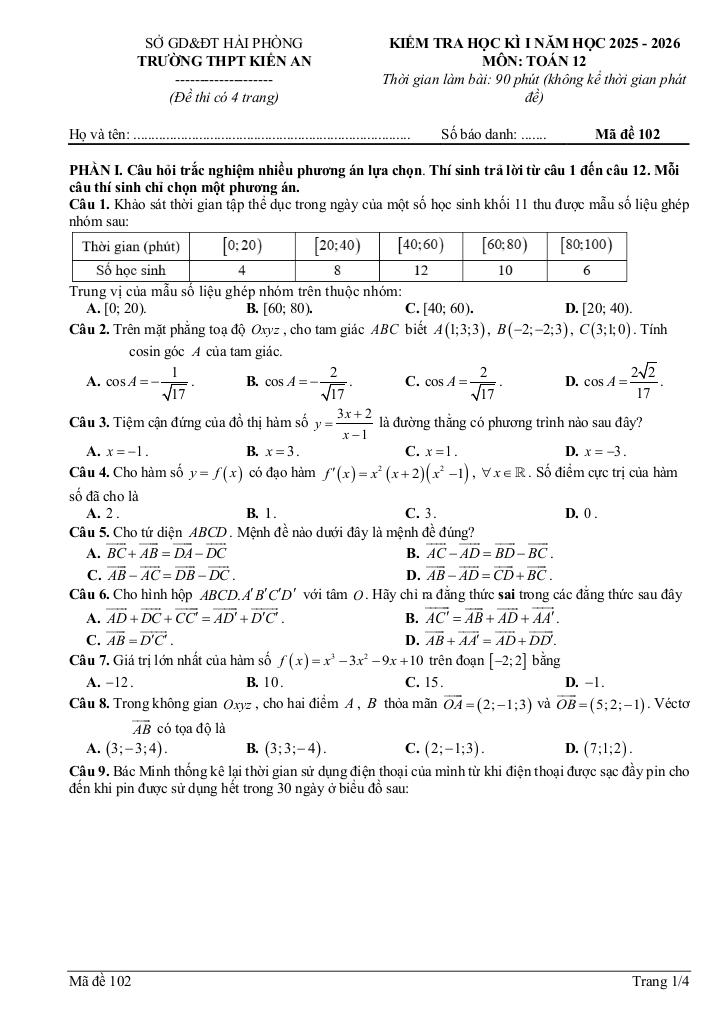 Giải Toán đề học kì 1 toán 12 năm 2025 – 2026 trường thpt kiến an – hải phòng với Đáp Án Mới Nhất