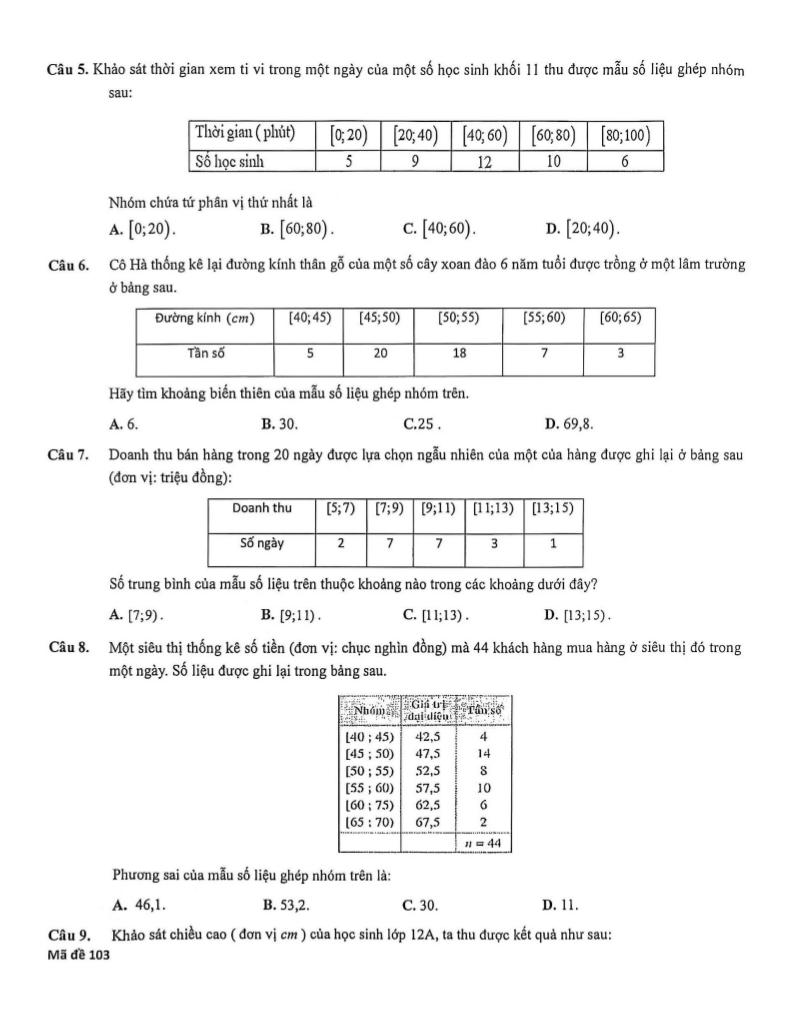 + Bảng sau đây cho biết chiều cao của học sinh lớp 5A. Tìm khoảng tứ phân vị của mẫu số liệu ghép nhóm về chiều cao của học sinh lớp 5A (kết quả làm tròn đến hàng phần chục).