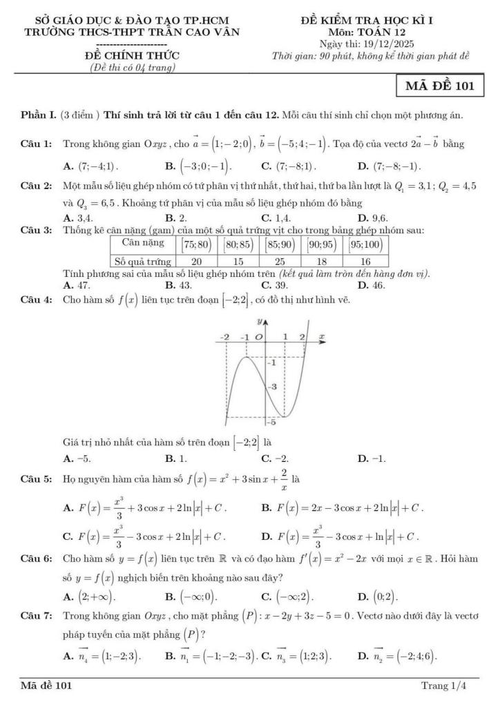 Trích dẫn Đề học kì 1 Toán 12 năm 2025 – 2026 trường Trần Cao Vân – TP HCM: