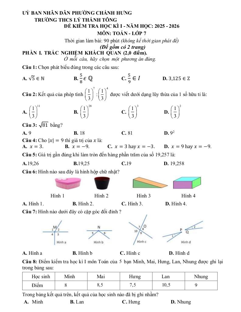 Trích dẫn Đề học kì 1 Toán 7 năm 2025 – 2026 trường THCS Lý Thánh Tông – TP HCM: