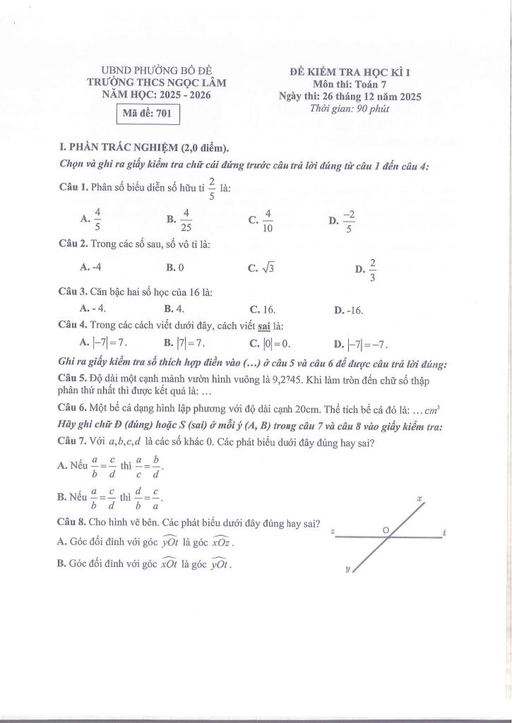 giaitoan.edu.vn giới thiệu đến quý thầy, cô giáo và các em học sinh đề chính thức kiểm tra cuối học kì 1 môn Toán 7 năm học 2025 – 2026 trường THCS Ngọc Lâm, phường Bồ Đề, thành phố Hà Nội. Kỳ thi được diễn ra vào ngày 26 tháng 12 năm 2025.