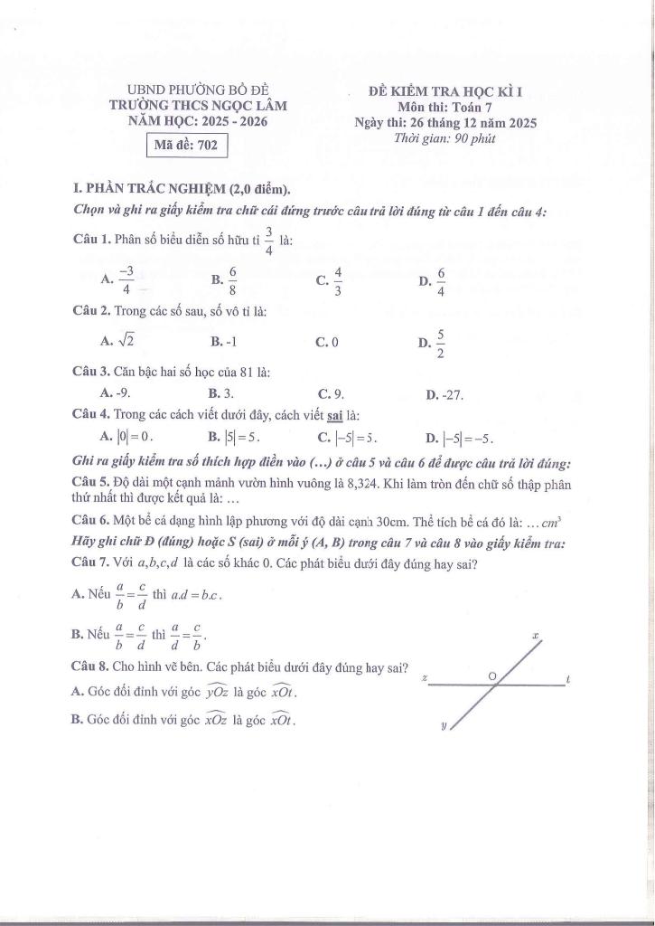 Giải Toán đề học kì 1 toán 7 năm 2025 – 2026 trường thcs ngọc lâm – hà nội với Đáp Án Mới Nhất