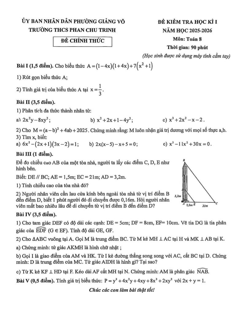 giaitoan.edu.vn giới thiệu đến quý thầy, cô giáo và các em học sinh đề kiểm tra cuối học kì 1 môn Toán 8 năm học 2025 – 2026 trường THCS Phan Chu Trinh, phường Giảng Võ, thành phố Hà Nội. Đề thi hình thức tự luận, gồm 05 bài toán, thời gian làm bài 90 phút.