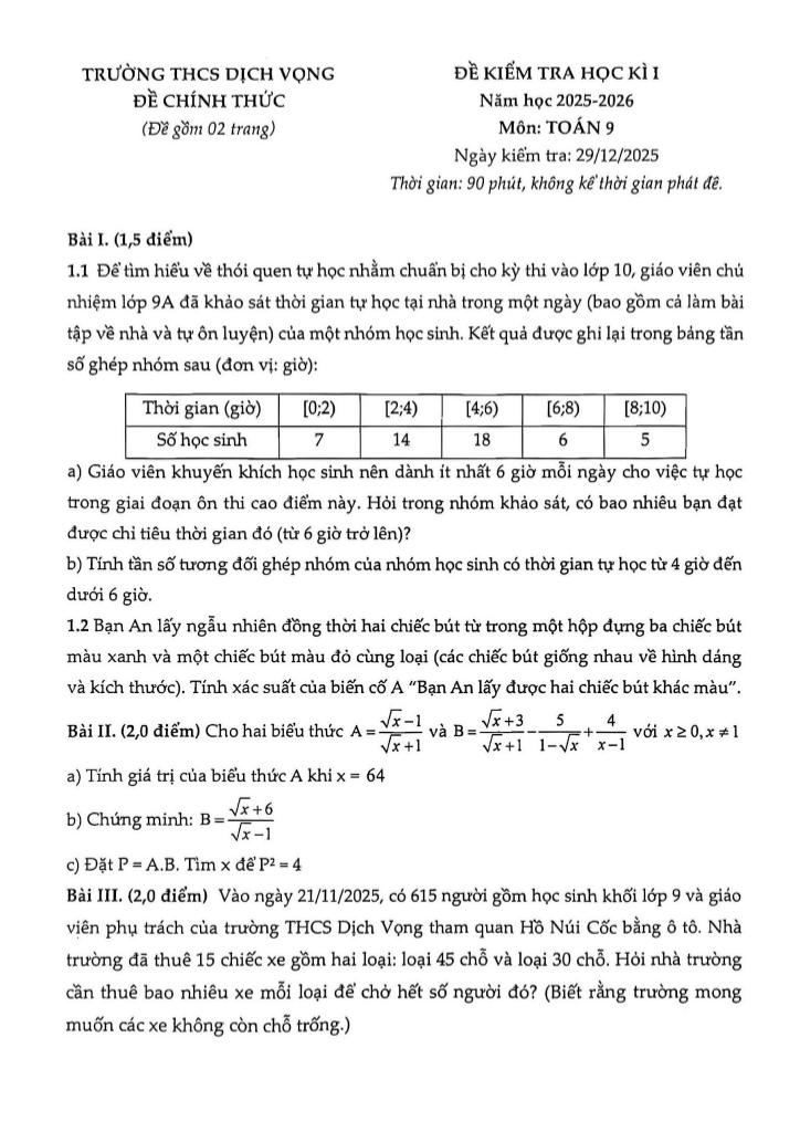 Trích dẫn Đề học kì 1 Toán 9 năm 2025 – 2026 trường THCS Dịch Vọng – Hà Nội: