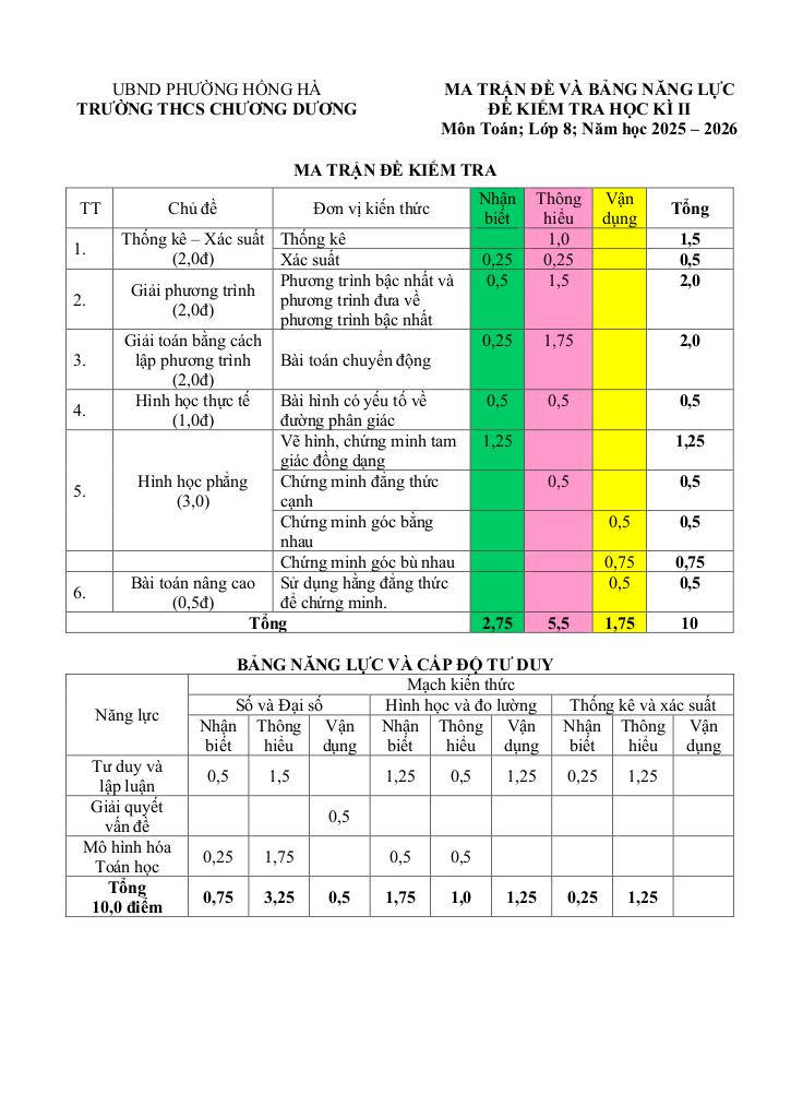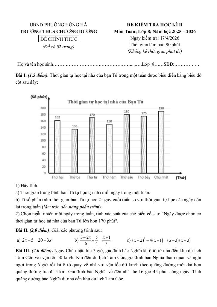 Nội dung Đề học kì 2 Toán 8 năm 2025 – 2026 trường THCS Chương Dương – Hà Nội: