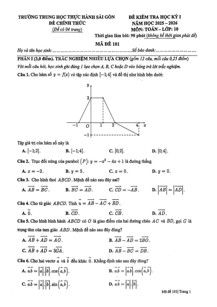 Trích dẫn Đề học kỳ 1 Toán 10 năm 2025 – 2026 trường TH Thực hành Sài Gòn – TP HCM: