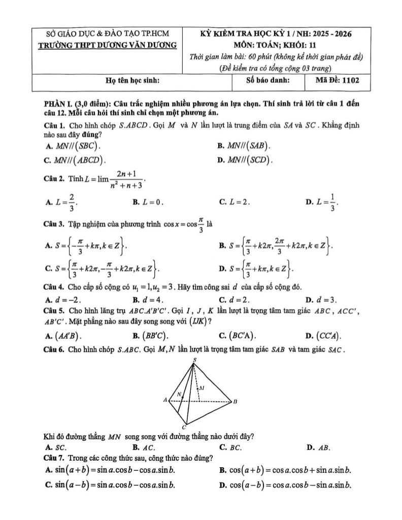 Trích dẫn Đề học kỳ 1 Toán 11 năm 2025 – 2026 trường THPT Dương Văn Dương – TP HCM:
