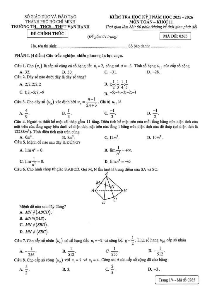 Giải Toán đề học kỳ 1 toán 11 năm 2025 – 2026 trường vạn hạnh – tp hcm với Đáp Án Mới Nhất