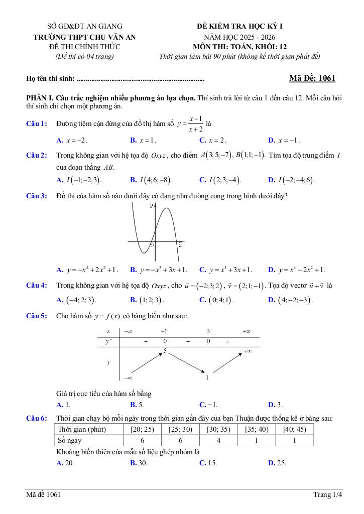 Trích dẫn Đề học kỳ 1 Toán 12 năm 2025 – 2026 trường THPT Chu Văn An – An Giang:
