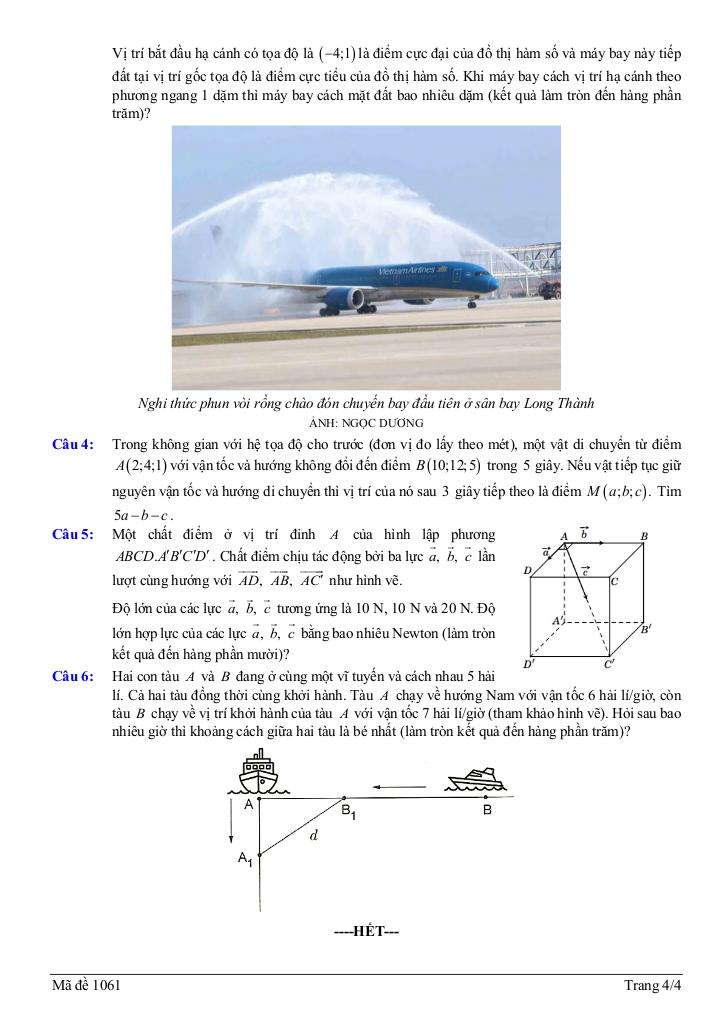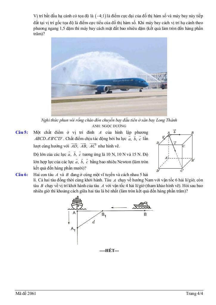 + Sáng 19.12.2025, tại sân bay Long Thành, Tổng công ty Cảng hàng không Việt Nam tổ chức lễ khai trương chuyến bay đầu tiên. Theo đó, lúc 8 giờ 10, máy bay Boeing 787-9 của Vietnam Airlines hạ cánh xuống sân bay Long Thành, biết quỹ đạo đường bay của nó được mô hình hóa toán học trong mặt phẳng với hệ tọa độ Oxy (với mỗi đơn vị trên mỗi trục coi là 1 dặm) có dạng đồ thị của hàm bậc ba. Vị trí bắt đầu hạ cánh có tọa độ là (−4;1) là điểm cực đại của đồ thị hàm số và máy bay này tiếp đất tại vị trí gốc tọa độ là điểm cực tiểu của đồ thị hàm số. Khi máy bay cách vị trí hạ cánh theo phương ngang 1 dặm thì máy bay cách mặt đất bao nhiêu dặm (kết quả làm tròn đến hàng phần trăm)? Nghi thức phun vòi rồng chào đón chuyến bay đầu tiên ở sân bay Long Thành.