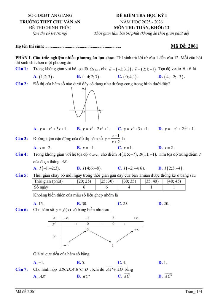Giải Toán đề học kỳ 1 toán 12 năm 2025 – 2026 trường thpt chu văn an – an giang với Đáp Án Mới Nhất