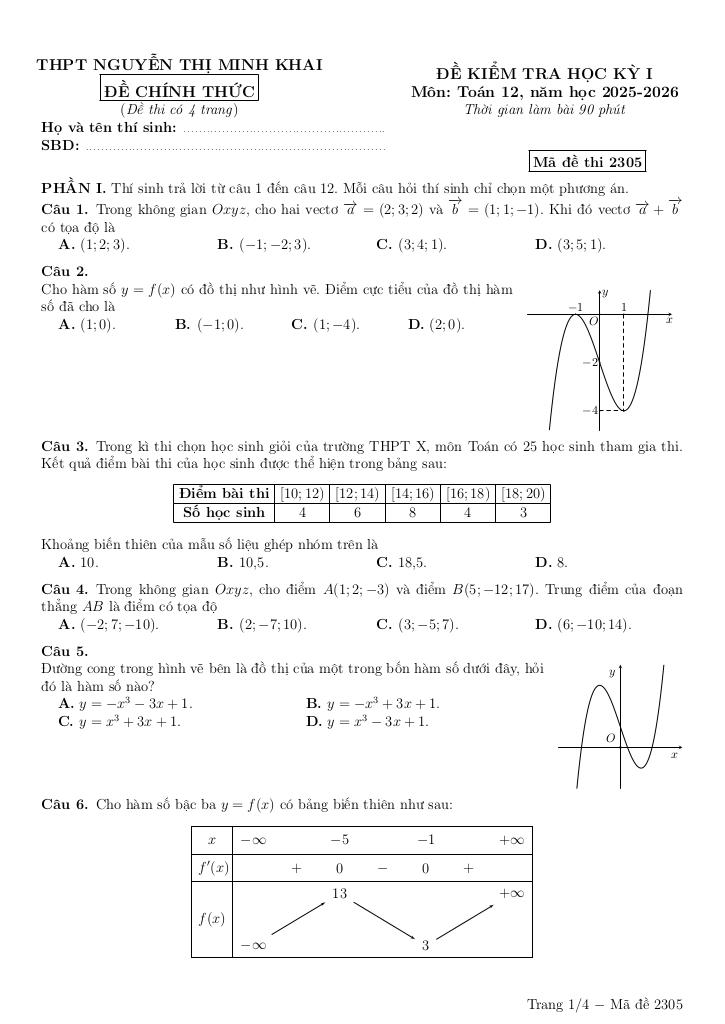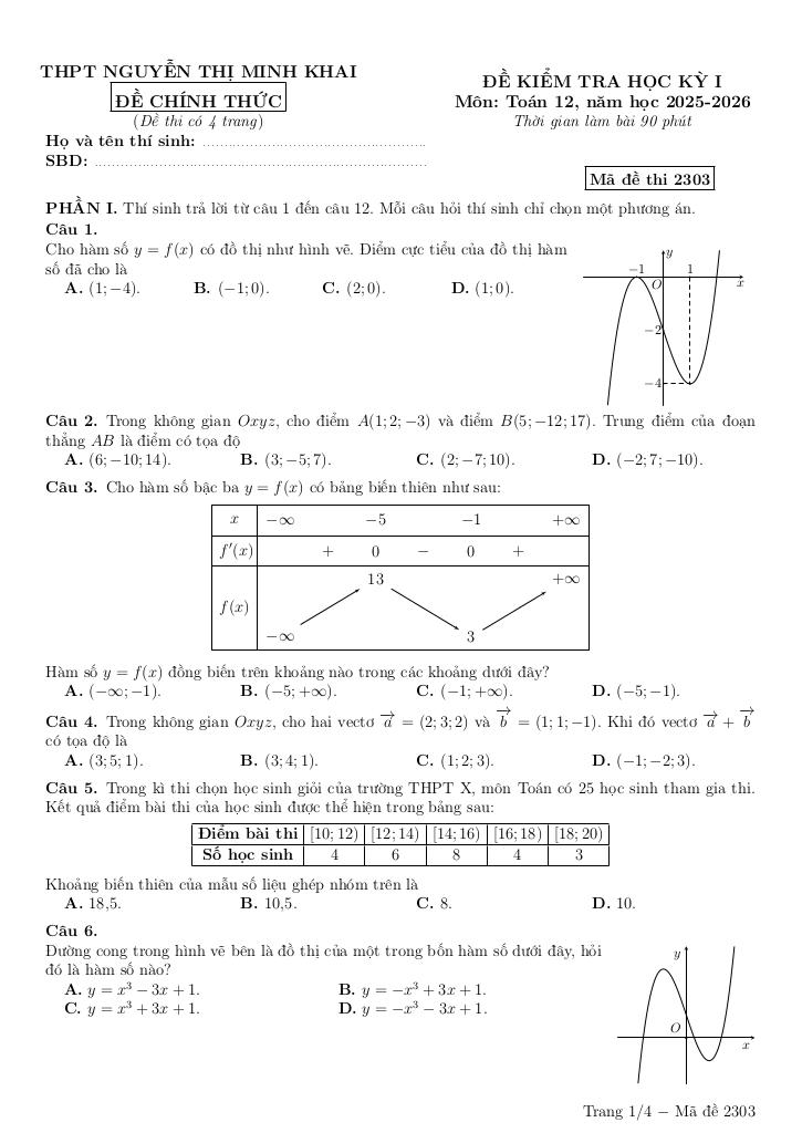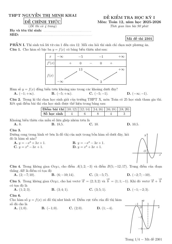 Trích dẫn Đề học kỳ 1 Toán 12 năm 2025 – 2026 trường THPT Nguyễn Thị Minh Khai – Hà Nội: