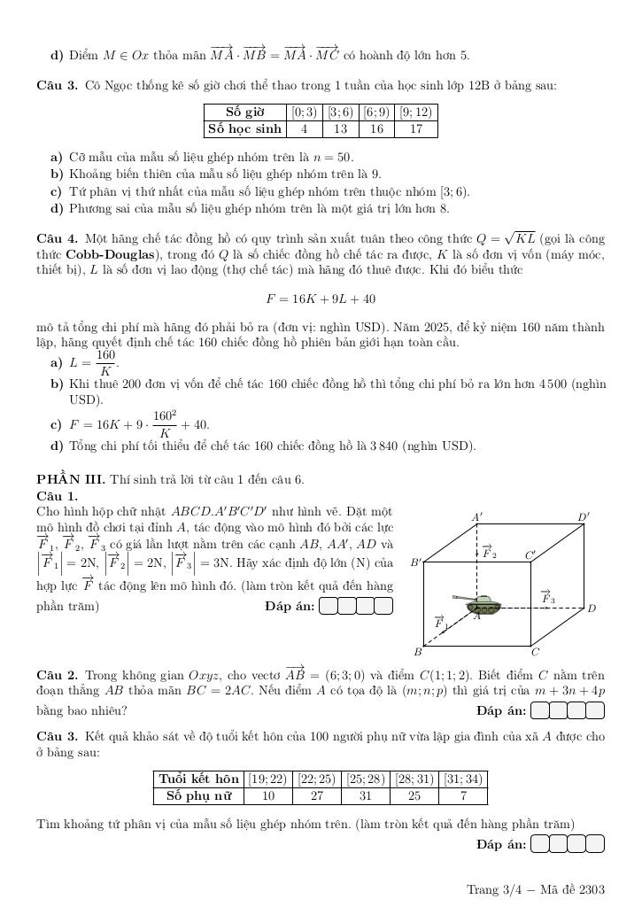 giaitoan.edu.vn giới thiệu đến quý thầy, cô giáo và các em học sinh đề kiểm tra cuối học kỳ 1 môn Toán 12 năm học 2025 – 2026 trường THPT Nguyễn Thị Minh Khai, thành phố Hà Nội. Đề thi gồm 12 câu trắc nghiệm nhiều phương án lựa chọn (3,0 điểm) + 04 câu trắc nghiệm đúng sai (4,0 điểm) + 06 câu trắc nghiệm trả lời ngắn (3,0 điểm), thời gian làm bài 90 phút, có đáp án mã đề 2301 – 2303 – 2305 – 2307.