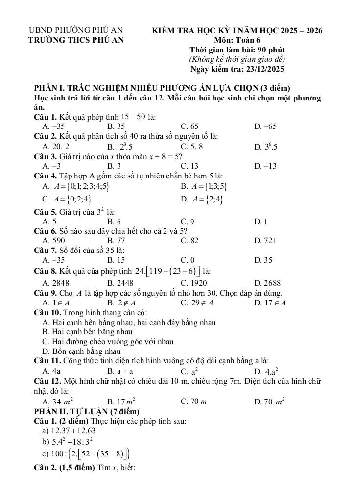 Trích dẫn Đề học kỳ 1 Toán 6 năm 2025 – 2026 trường THCS Phú An – TP HCM:
