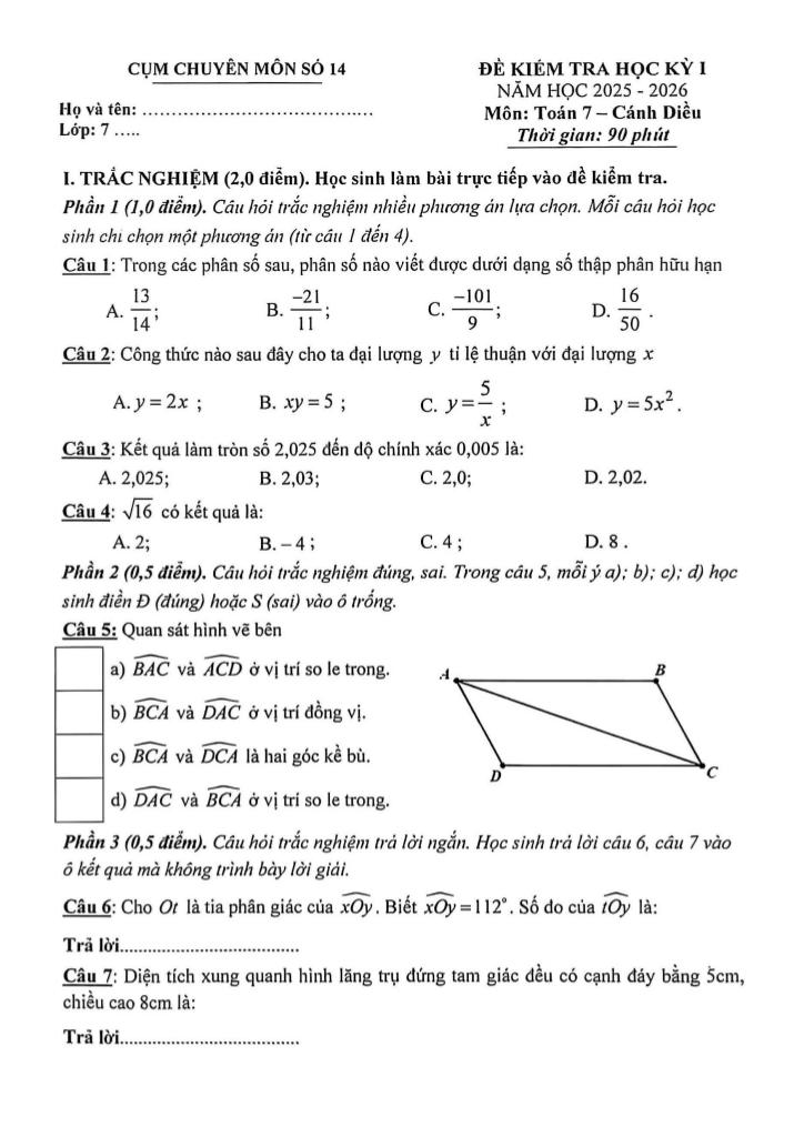 Toán học luôn là một môn học quan trọng, giúp học sinh phát triển tư duy logic và kỹ năng giải quyết vấn đề. Để hỗ trợ các bạn học sinh và giáo viên trong việc học tập và giảng dạy, bài viết này sẽ cung cấp lời giải chi tiết và đáp án chính xác cho chủ đề đề học kỳ 1 toán 7 năm 2025 – 2026 cụm chuyên môn số 14 – hà nội, giúp bạn hiểu sâu và tự tin hơn khi làm bài tập.