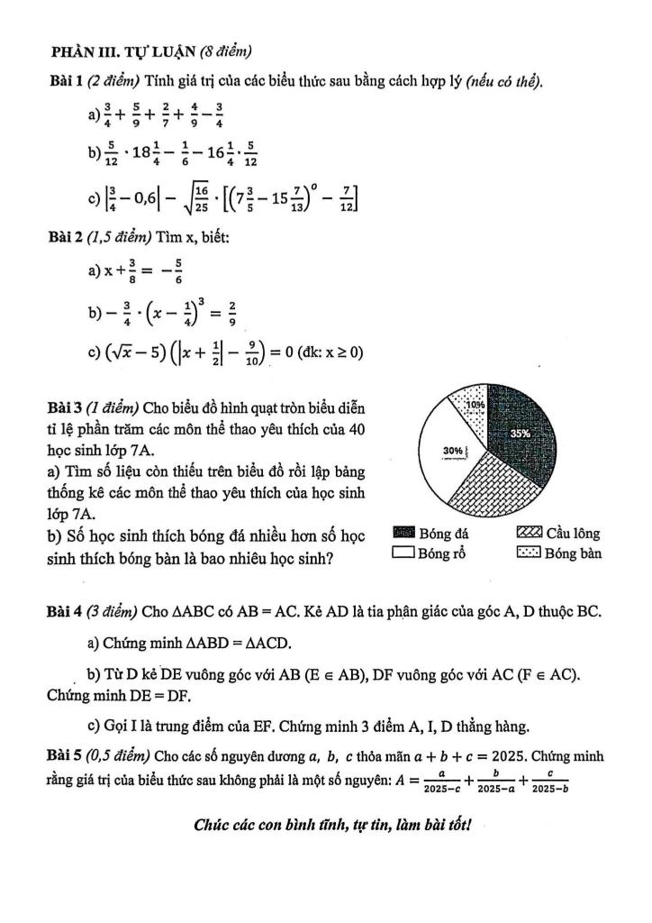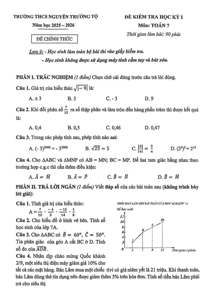 Trích dẫn Đề học kỳ 1 Toán 7 năm 2025 – 2026 trường THCS Nguyễn Trường Tộ – Hà Nội: