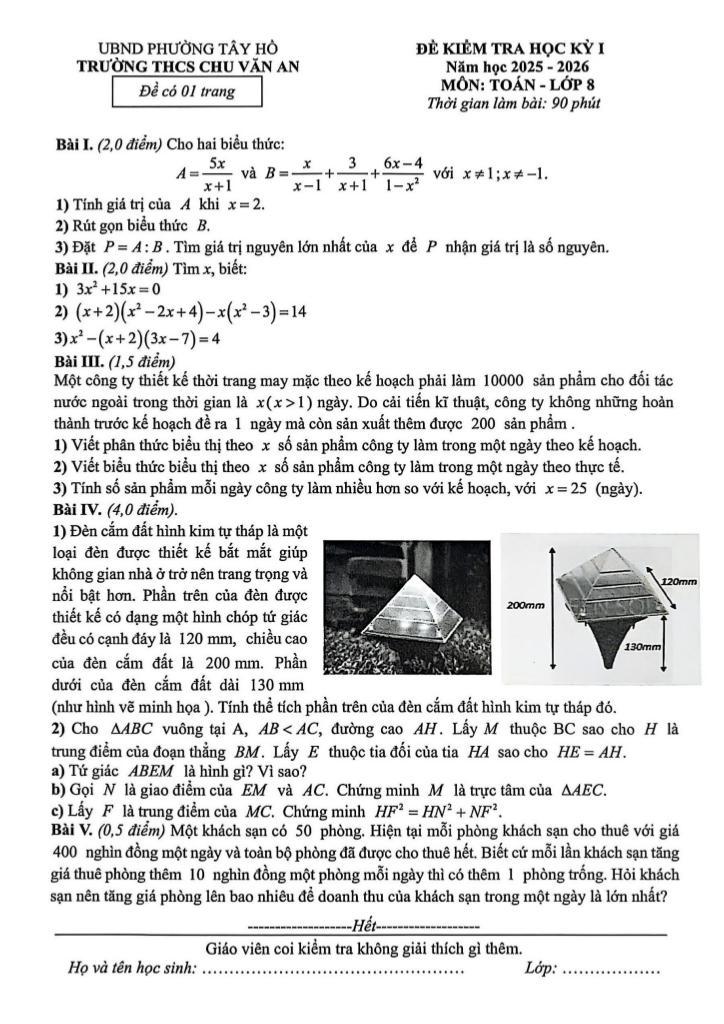 Trích dẫn Đề học kỳ 1 Toán 8 năm 2025 – 2026 trường THCS Chu Văn An – Hà Nội:
