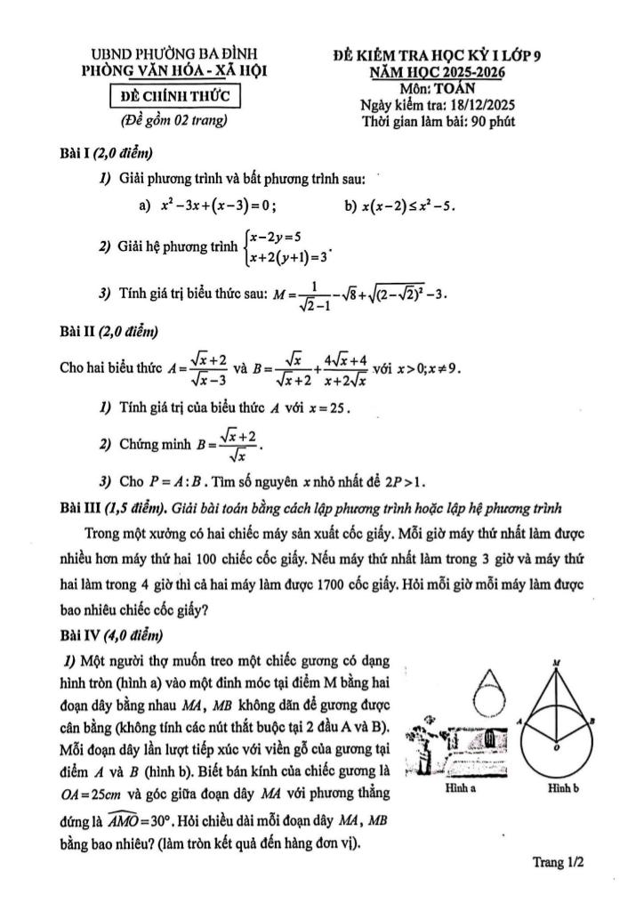 Trích dẫn Đề học kỳ 1 Toán 9 năm 2025 – 2026 phường Ba Đình – Hà Nội: