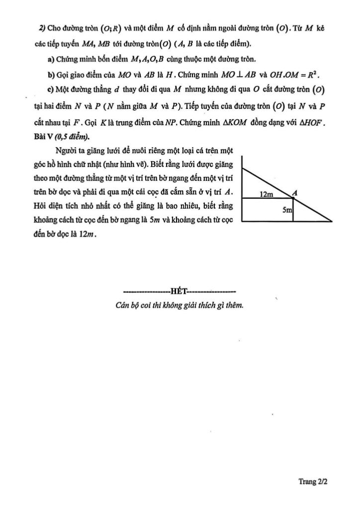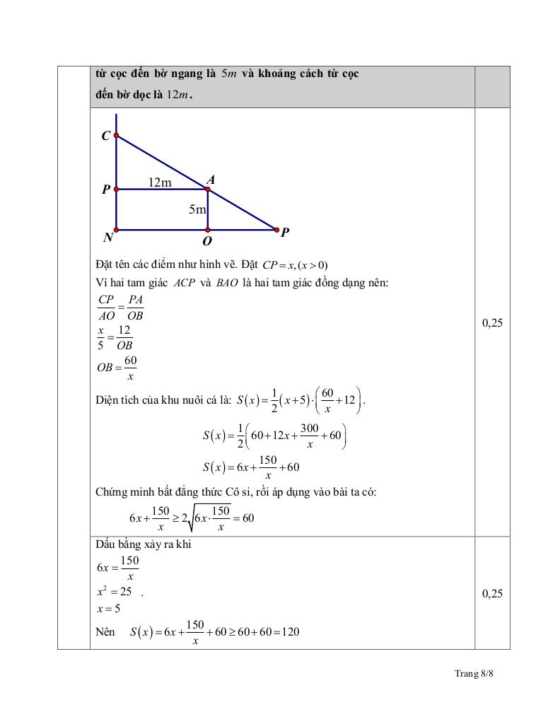 + Người ta giăng lưới để nuôi riêng một loại cá trên một góc hồ hình chữ nhật (như hình vẽ). Biết rằng lưới được giăng theo một đường thẳng từ một vị trí trên bờ ngang đến một vị trí trên bờ dọc và phải đi qua một cái cọc đã cắm sẵn ở vị trí A. Hỏi diện tích nhỏ nhất có thể giăng là bao nhiêu, biết rằng khoảng cách từ cọc đến bờ ngang là 5m và khoảng cách từ cọc đến bờ dọc là 12m.