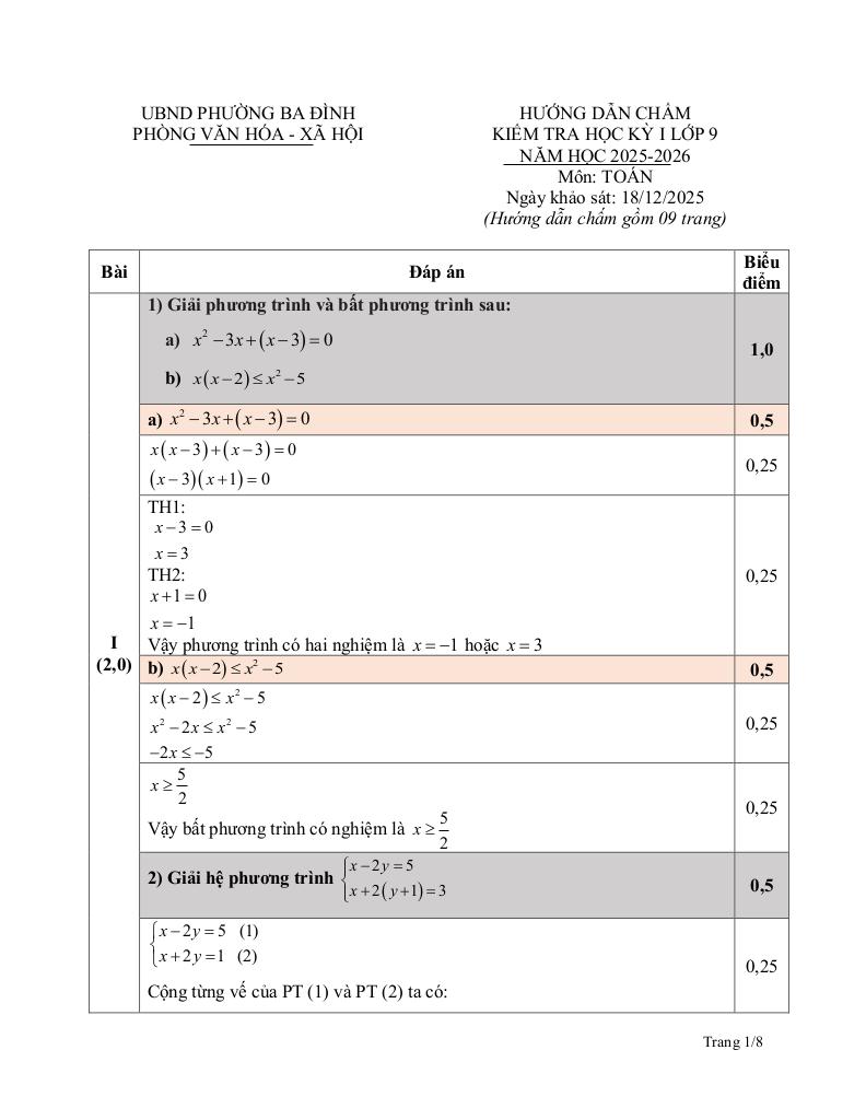Giải Toán đề học kỳ 1 toán 9 năm 2025 – 2026 phường ba đình – hà nội với Đáp Án Mới Nhất