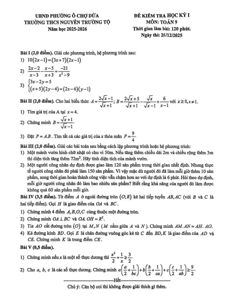 Trích dẫn Đề học kỳ 1 Toán 9 năm 2025 – 2026 trường THCS Nguyễn Trường Tộ – Hà Nội: