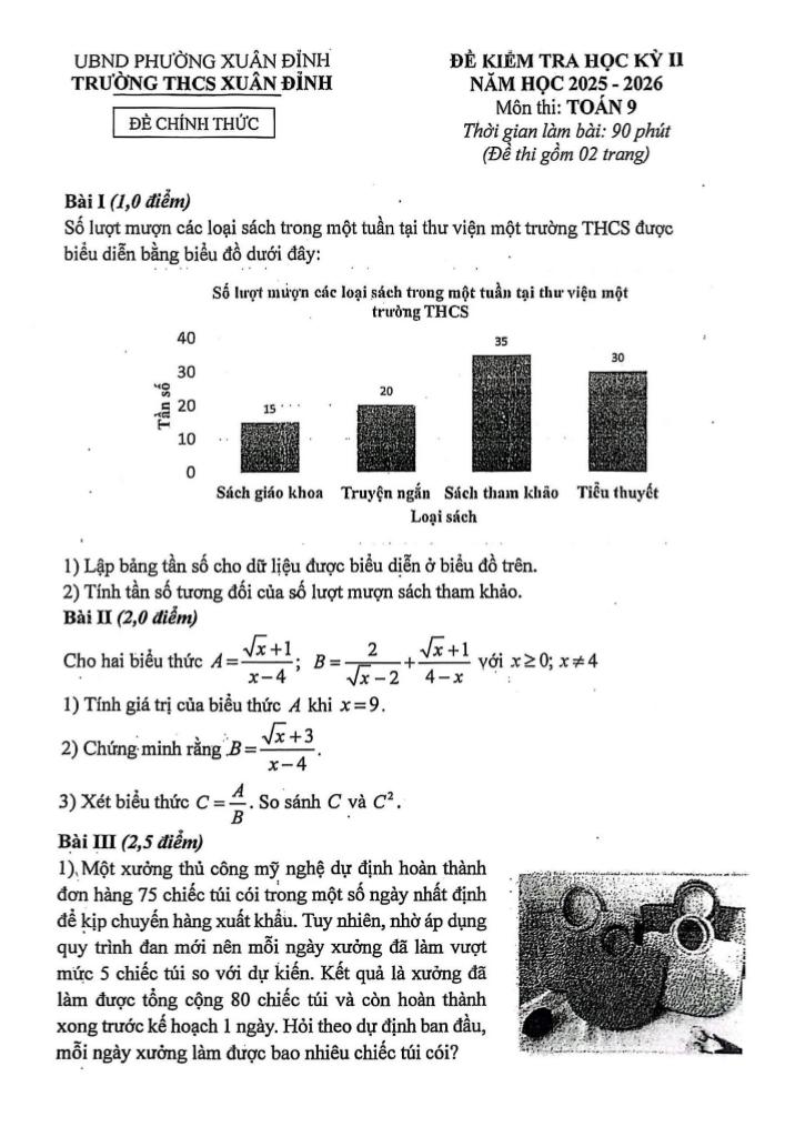 Trích dẫn Đề học kỳ 2 Toán 9 năm 2025 – 2026 trường THCS Xuân Đỉnh – Hà Nội: