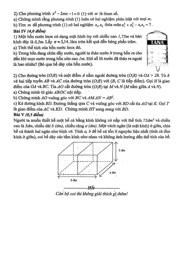 + Một bồn nước inox có dạng một hình trụ với chiều cao 1,75m và bán kính đáy là 0,5m. Lấy π ≈ 3,14, làm tròn kết quả đến hàng phần trăm. a) Tính thể tích của bồn nước inox đó. b) Trong bồn đang chứa đầy nước, người ta tháo nước ở trong bồn ra cho đến khi mực nước trong bồn còn cao 1m. Hỏi số lít nước đã tháo ra ngoài là bao nhiêu? (Bỏ qua bề dày của bồn nước).