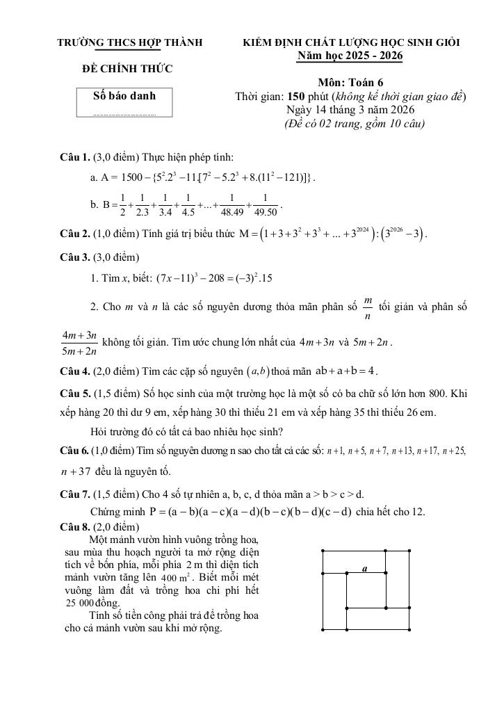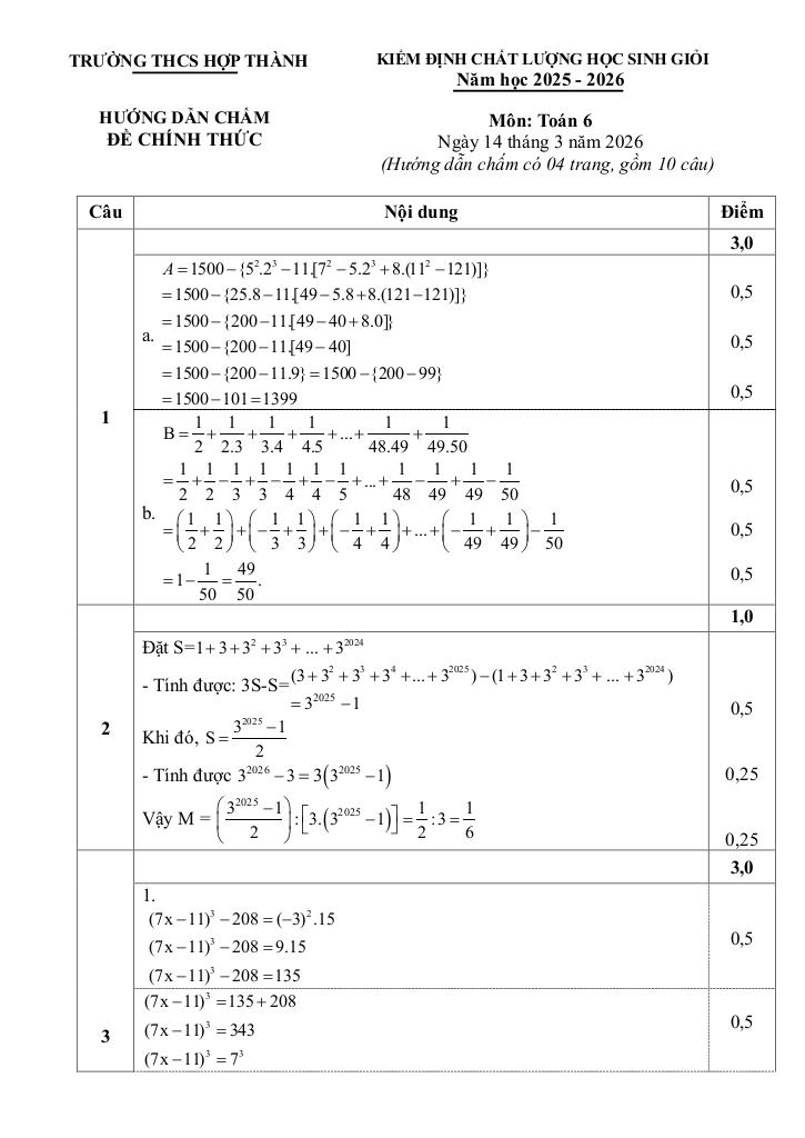 giaitoan.edu.vn giới thiệu đến quý thầy, cô giáo và các em học sinh đề kiểm định chất lượng học sinh giỏi môn Toán 6 năm học 2025 – 2026 trường THCS Hợp Thành, tỉnh Thanh Hóa. Kỳ thi được diễn ra vào ngày 14 tháng 03 năm 2026. Đề thi có đáp án, lời giải chi tiết và hướng dẫn chấm điểm.