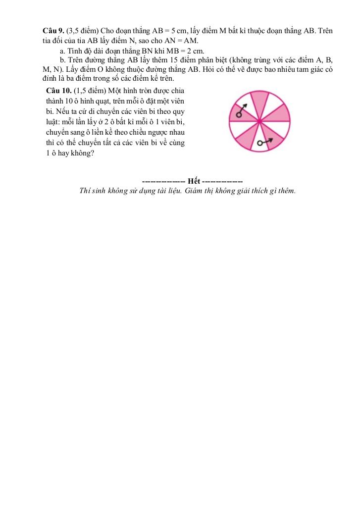 + Cho đoạn thẳng AB = 5 cm, lấy điểm M bất kì thuộc đoạn thẳng AB. Trên tia đối của tia AB lấy điểm N, sao cho AN = AM. a. Tính độ dài đoạn thẳng BN khi MB = 2 cm. b. Trên đường thẳng AB lấy thêm 15 điểm phân biệt (không trùng với các điểm A, B, M, N). Lấy điểm O không thuộc đường thẳng AB. Hỏi có thể vẽ được bao nhiêu tam giác có đỉnh là ba điểm trong số các điểm kể trên.