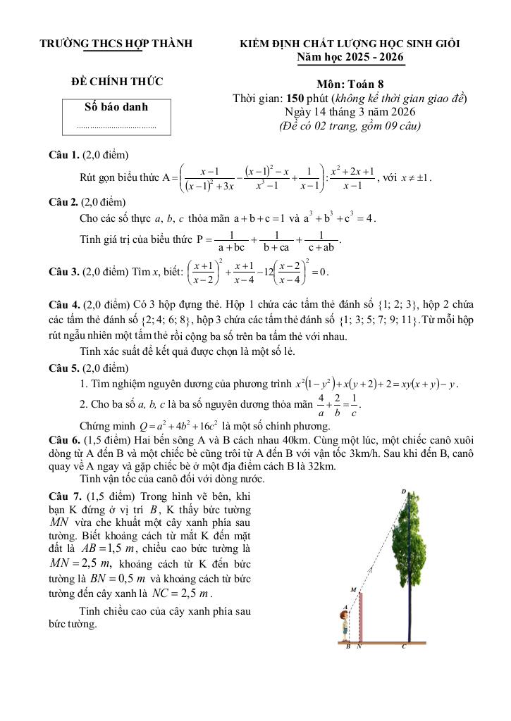 giaitoan.edu.vn giới thiệu đến quý thầy, cô giáo và các em học sinh đề kiểm định chất lượng học sinh giỏi môn Toán 8 năm học 2025 – 2026 trường THCS Hợp Thành, tỉnh Thanh Hóa. Kỳ thi được diễn ra vào ngày 14 tháng 03 năm 2026. Đề thi có đáp án, lời giải chi tiết và hướng dẫn chấm điểm.