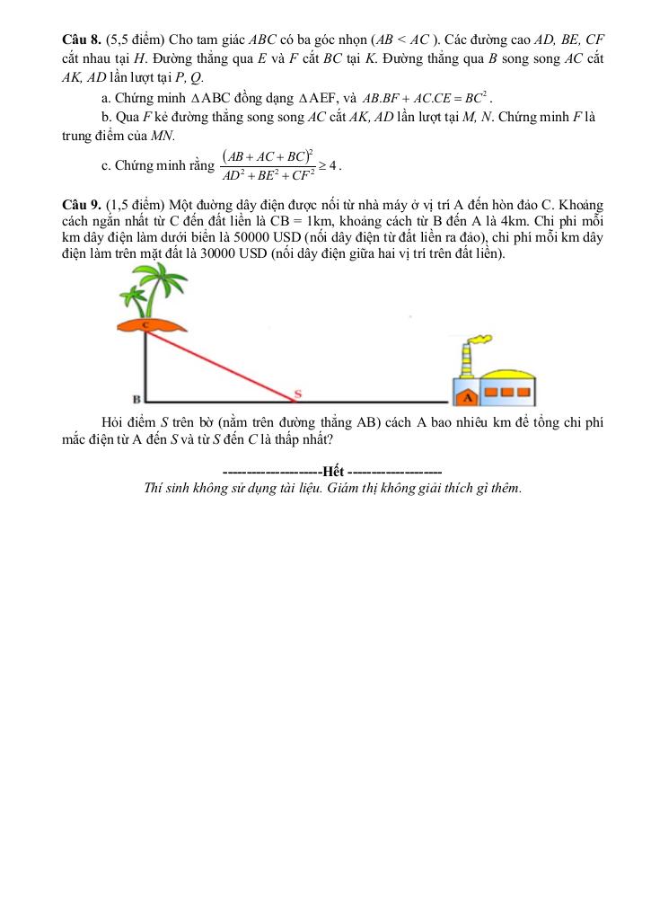 + Một đuờng dây điện được nối từ nhà máy ở vị trí A đến hòn đảo C. Khoảng cách ngắn nhất từ C đến đất liền là CB = 1km, khoảng cách từ B đến A là 4km. Chi phi mỗi km dây điện làm dưới biển là 50000 USD (nối dây điện từ đất liền ra đảo), chi phí mỗi km dây điện làm trên mặt đất là 30000 USD (nối dây điện giữa hai vị trí trên đất liền). Hỏi điểm S trên bờ (nằm trên đường thẳng AB) cách A bao nhiêu km để tổng chi phí mắc điện từ A đến S và từ S đến C là thấp nhất?