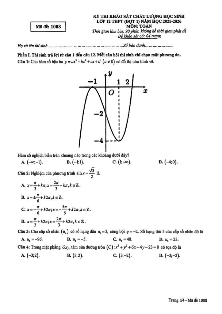 Trích dẫn Đề khảo sát chất lượng Toán 12 đợt 1 năm 2025 – 2026 sở GD&ĐT Phú Thọ: