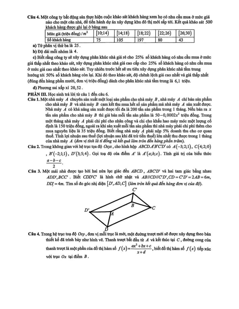 + Một công ty bất động sản thực hiện cuộc khảo sát khách hàng xem họ có nhu cầu mua ở mức giá nào cho một căn nhà, để tiến hành dự án xây dựng khu đô thị mới sắp tới. Kết quả khảo sát 500 khách hàng được ghi lại ở bảng sau: Mức giá (triệu đồng)/m²: [10;14) [14;18) [18;22) [22;26) [26;30) – Số khách hàng: 75 105 197 80 43. a) Tứ phân vị thứ ba là 25. b) Độ dài mỗi nhóm là 4. c) Biết rằng công ty sẽ xây dựng phân khúc nhà giá rẻ cho 25% số khách hàng có nhu cầu mua ở mức giá thấp nhất theo khảo sát, xây dựng phân khúc nhà giá cao cấp cho 25% số khách hàng có nhu cầu mua ở mức giá cao nhất theo khảo sát. Tuy nhiên trước hết sẽ ưu tiên xây dựng phân khúc nhà tầm trung hướng tới 50% số khách hàng còn lại. Khi đó theo khảo sát, độ chênh lệch giá cao nhất và giá thấp nhất (đúng đến hàng phần mười, đơn vị triệu đồng) dành cho phân khúc nhà tầm trung là 6,1 triệu. d) Phương sai xấp xỉ 20,52.
