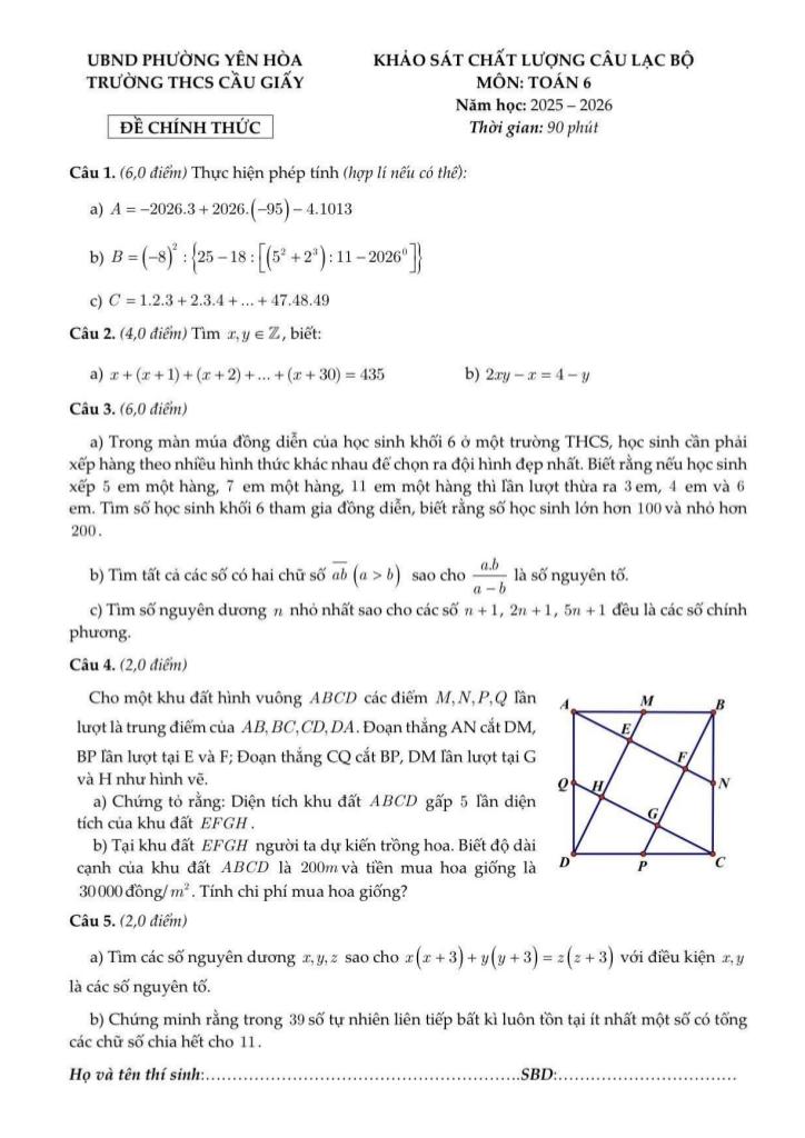 Trích dẫn Đề khảo sát CLB Toán 6 năm 2025 – 2026 trường THCS Cầu Giấy – Hà Nội: