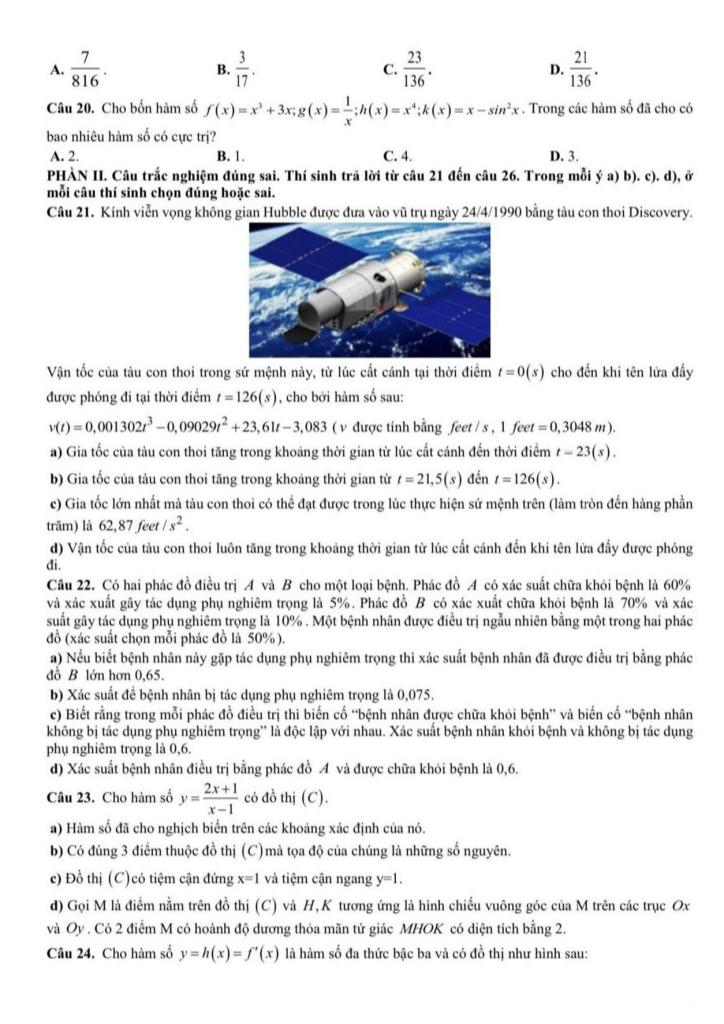 + Có hai phác đồ điều trị A và B cho một loại bệnh. Phác đồ A có xác suất chữa khỏi bệnh là 60% và xác suất gây tác dụng phụ nghiêm trọng là 5%. Phác đồ B có xác suất chữa khỏi bệnh là 70% và xác suất gây tác dụng phụ nghiêm trọng là 10%. Một bệnh nhân được điều trị ngẫu nhiên bằng một trong hai phác đồ (xác suất chọn mỗi phác đồ là 50%). a) Nếu biết bệnh nhân này gặp tác dụng phụ nghiêm trọng thì xác suất bệnh nhân đã được điều trị bằng phác đồ B lớn hơn 0,65. b) Xác suất để bệnh nhân bị tác dụng phụ nghiêm trọng là 0,075. e) Biết rằng trong mỗi phác đồ điều trị thì biến cố “bệnh nhân được chữa khỏi bệnh” và biến cố “bệnh nhân không bị tác dụng phụ nghiêm trọng” là độc lập với nhau. Xác suất bệnh nhân khỏi bệnh và không bị tác dụng phụ nghiêm trọng là 0,6. d) Xác suất bệnh nhân điều trị bằng phác đồ A và được chữa khỏi bệnh là 0,6.
