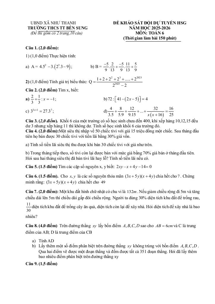 Trích dẫn Đề khảo sát HSG Toán 6 năm 2025 – 2026 trường THCS TT Bến Sung – Thanh Hóa:
