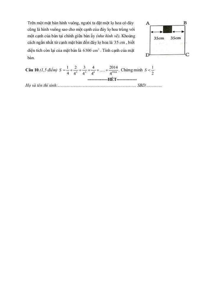 + Trên một mặt bàn hình vuông, người ta đặt một lọ hoa có đáy cũng là hình vuông sao cho một cạnh của đáy lọ hoa trùng với một cạnh của bàn tại chính giữa bàn ấy (như hình vẽ). Khoảng cách ngắn nhất từ cạnh mặt bàn đến đáy lọ hoa là 35 cm , biết diện tích còn lại của mặt bàn là 6300 cm2. Tính cạnh của mặt bàn.