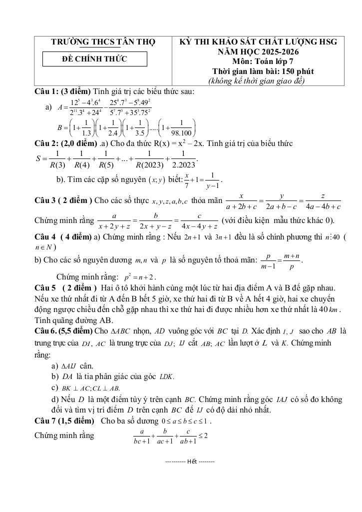 Trích dẫn Đề khảo sát HSG Toán 7 năm 2025 – 2026 trường THCS Tân Thọ – Thanh Hóa: