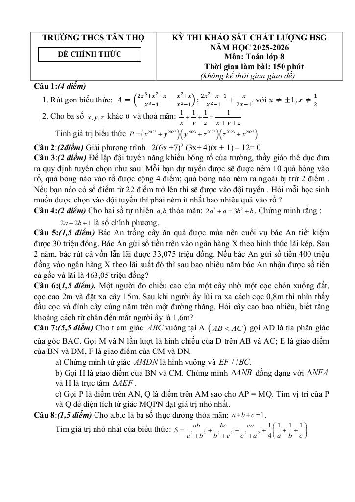 Trích dẫn Đề khảo sát HSG Toán 8 năm 2025 – 2026 trường THCS Tân Thọ – Thanh Hóa: