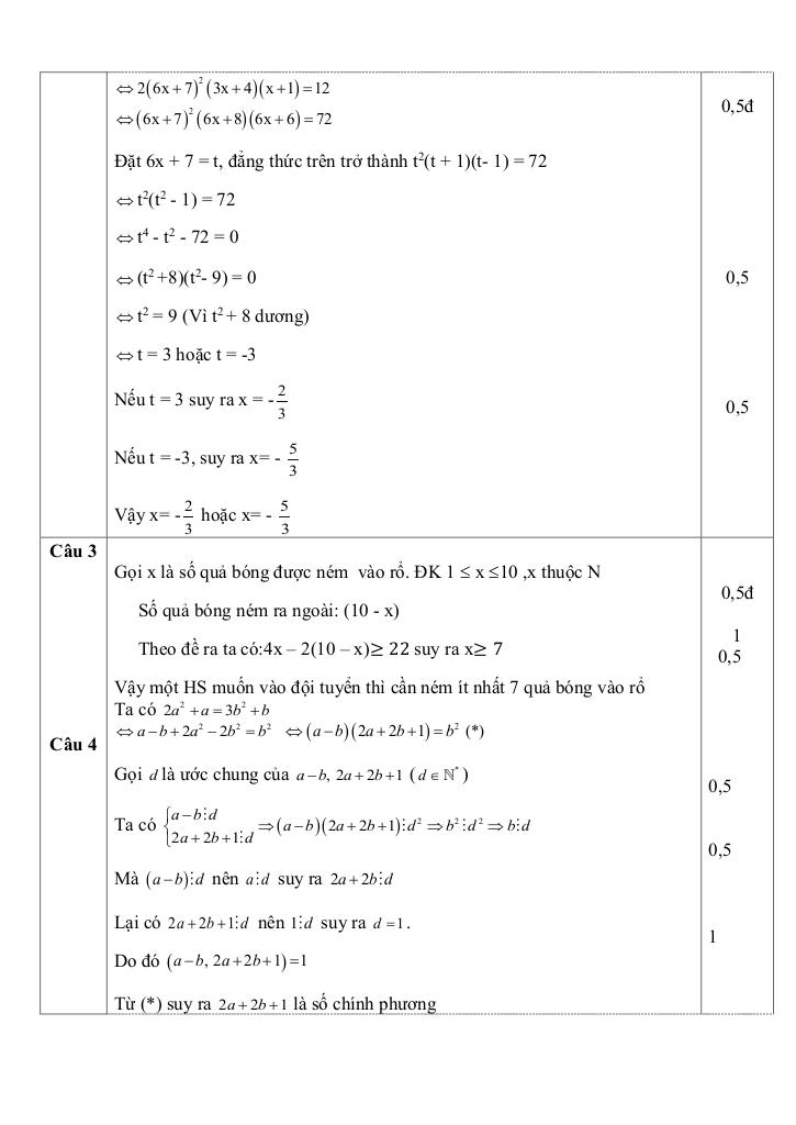 + Để lập đội tuyển năng khiếu bóng rổ của trường, thầy giáo thể dục đưa ra quy định tuyển chọn như sau: Mỗi bạn dự tuyển được sẽ được ném 10 quả bóng vào rổ, quả bóng nào vào rổ được cộng 4 điểm; quả bóng nào ném ra ngoài bị trừ 2 điểm. Nếu bạn nào có số điểm từ 22 điểm trở lên thì sẽ được vào đội tuyển. Hỏi mỗi học sinh muốn được chọn vào đội tuyển thì phải ném ít nhất bao nhiêu quả vào rổ?