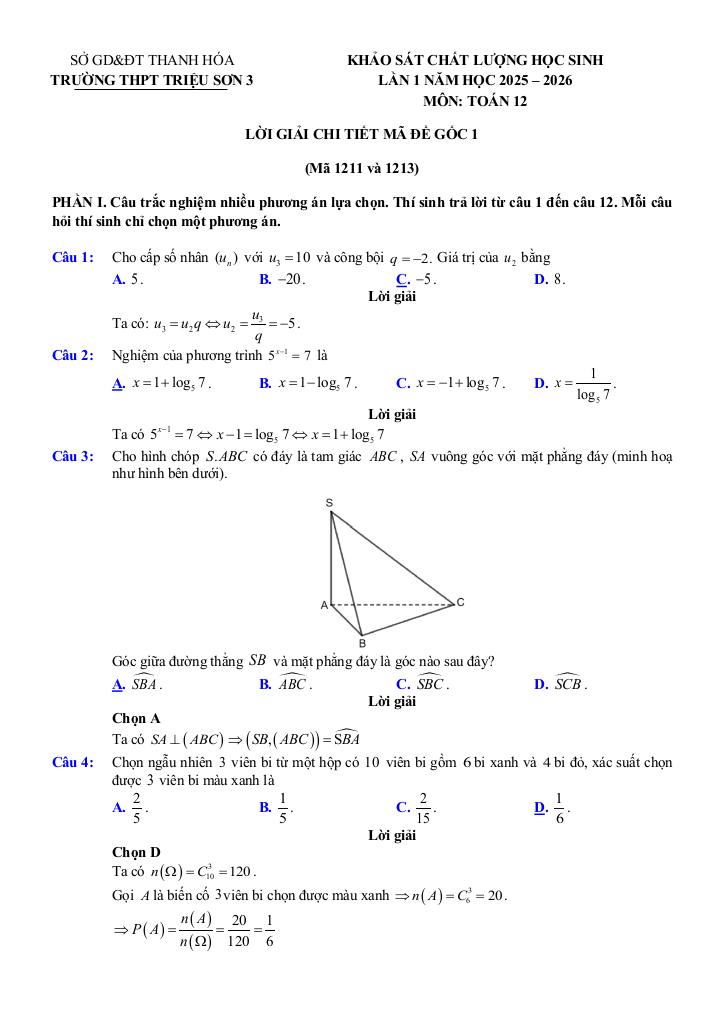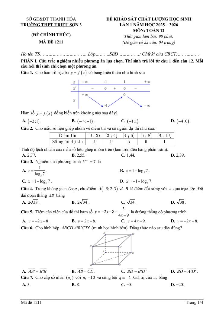 Giải Toán đề khảo sát lần 1 toán 12 năm 2025 – 2026 trường thpt triệu sơn 3 – thanh hóa với Đáp Án Mới Nhất